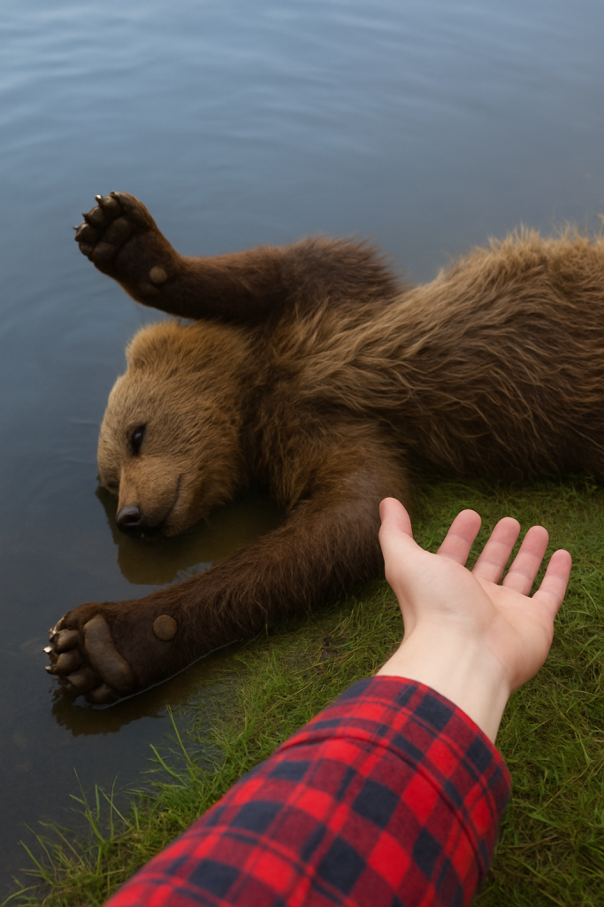 I took a few careful steps closer to the riverbank. Floating on the surface was a small bear cub. Its little body was motionless, its paws spread open as if reaching for something invisible. The sight froze me in place.